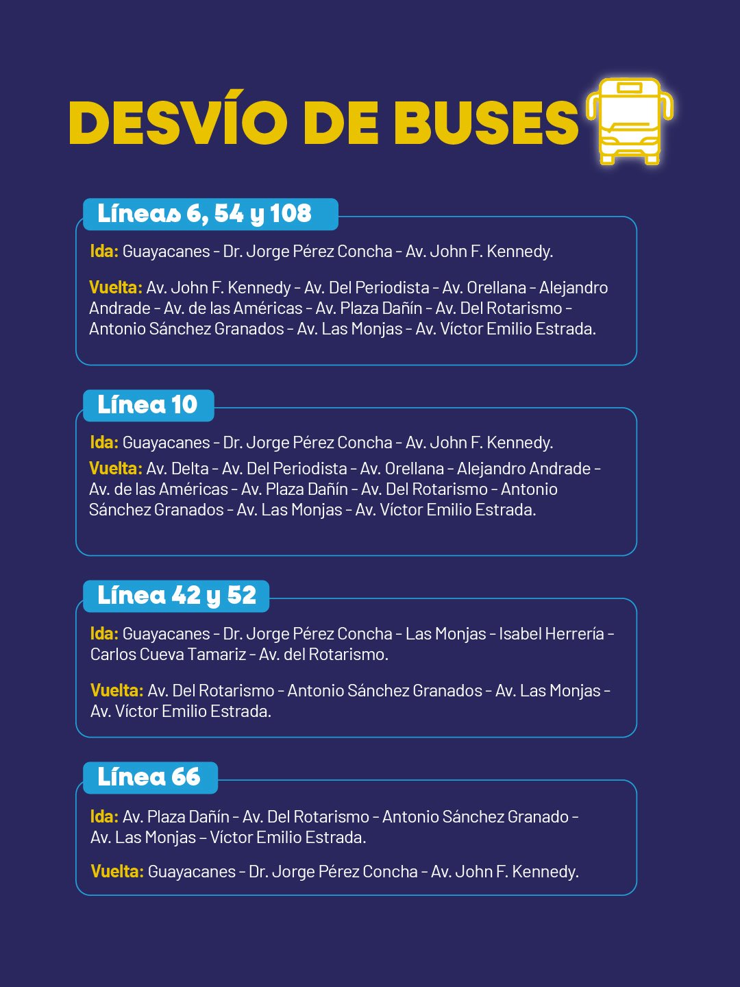 Los buses también tendrán desvíos durante el cierre de la vía. Las líneas C1A, C1B y la C1C, se desviarán por la calle Chimborazo. La línea 89 irá por Víctor Manuel Rendón – Baquerizo Moreno – Junín. La calle Colón se mantendrá unidireccional en sentido Malecón – García Avilés.