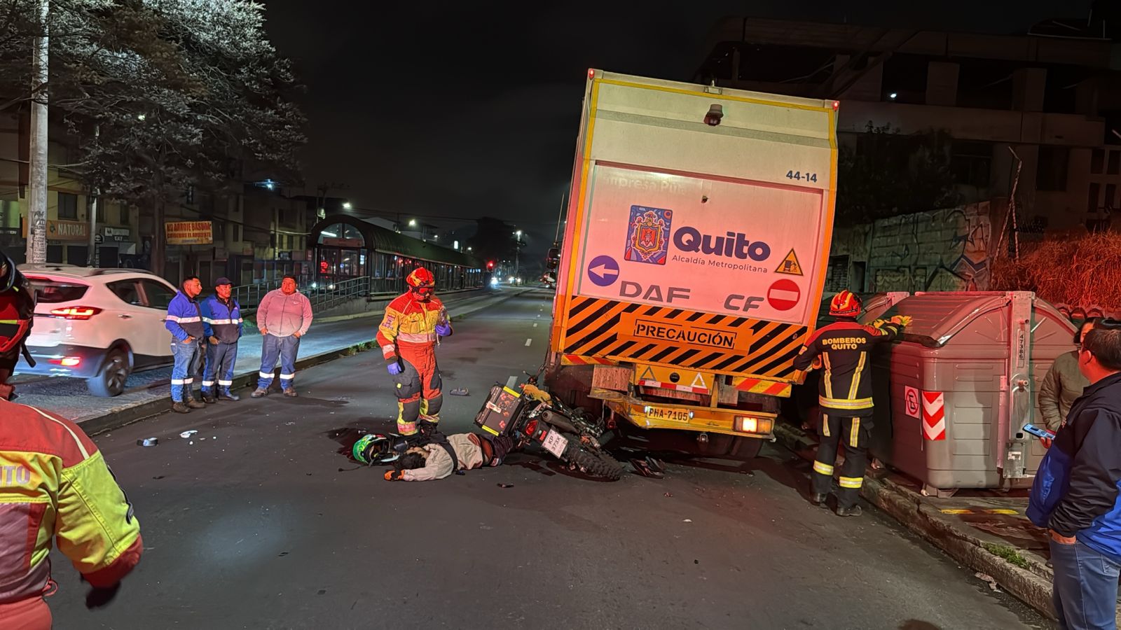 Un siniestro de tránsito ocurrió a las 04:31 de este jueves, 13 de noviembre de 2025, en la avenida Mariscal Sucre y Chicaña, en el sector de La Biloxi. El hecho involucró a un motociclista y a un vehículo de carga de la Empresa Pública Metropolitana de Aseo de Quito (Emaseo), que desarrollaba actividades operativas en la zona.