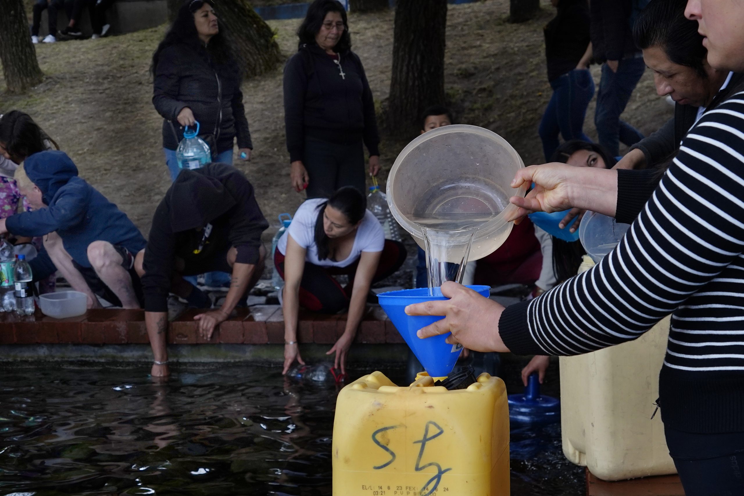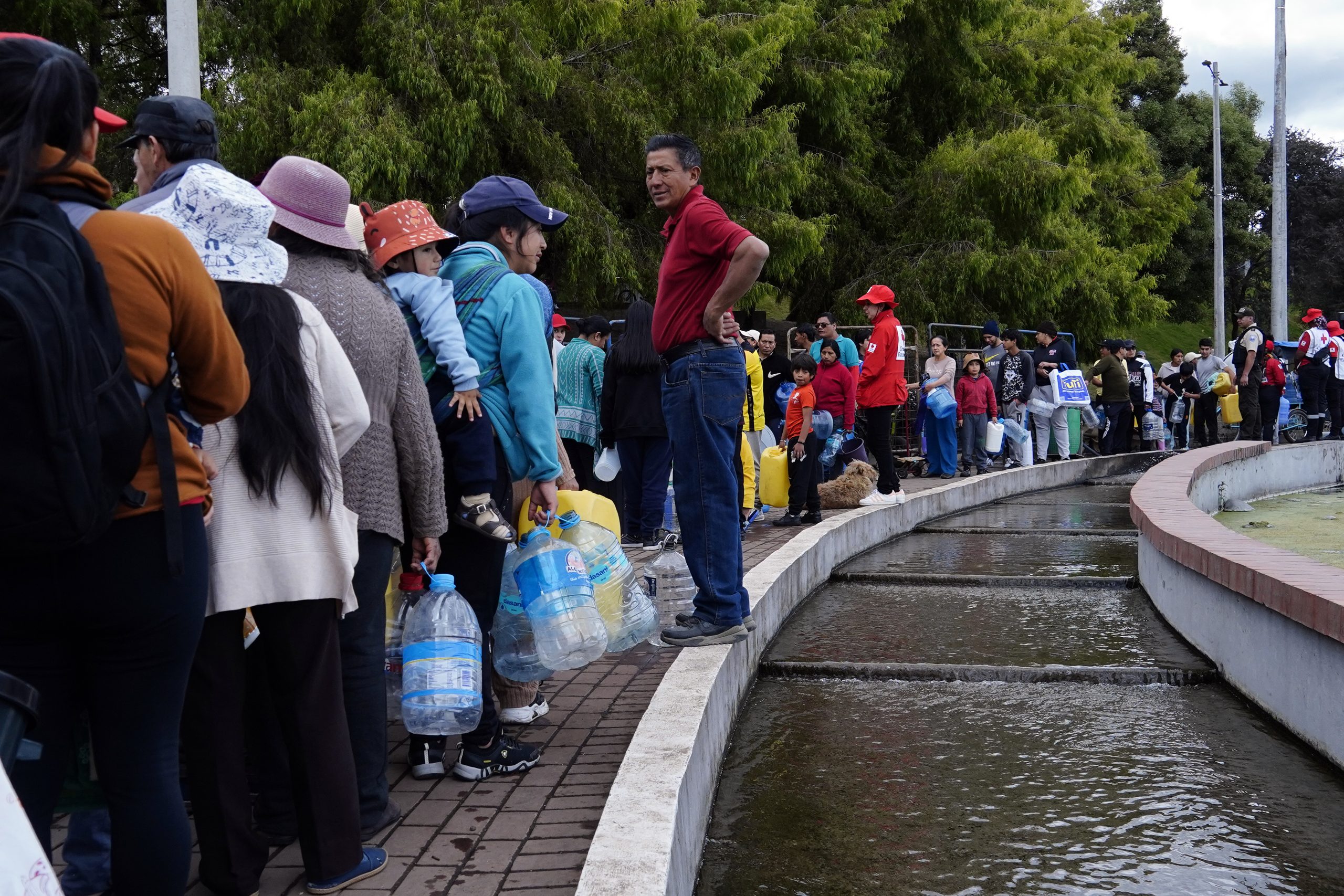 — QUITO (17-07-2025).- La gente se abastece de agua en el parque Nueva Auroroa, en el barrio del mismo nombre, en el sur de Quito, debido a la emergencia porducida por la rotura de la tubería en la Mica, sector de captación de agua, en la reserva del Antisana.