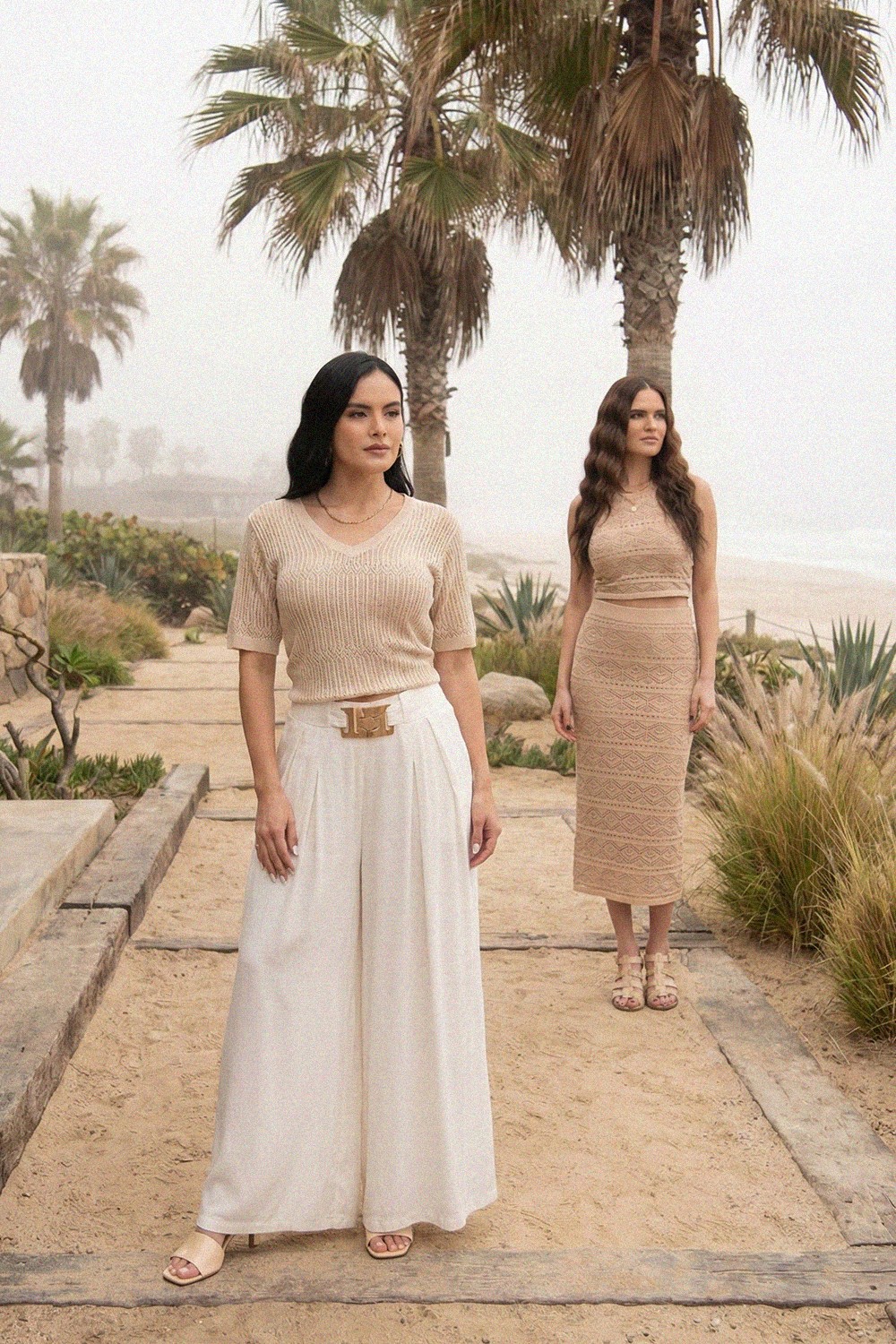 Las siluetas juegan con largos versátiles, desde prendas más cortas hasta opciones más fluidas, integrando linos en las partes bajas y una paleta de tonos neutros que transmiten ligereza, comodidad y feminidad. Son prendas pensadas para transformarse fácilmente del día a la noche y de la noche al día, a través del uso de accesorios y calzado.