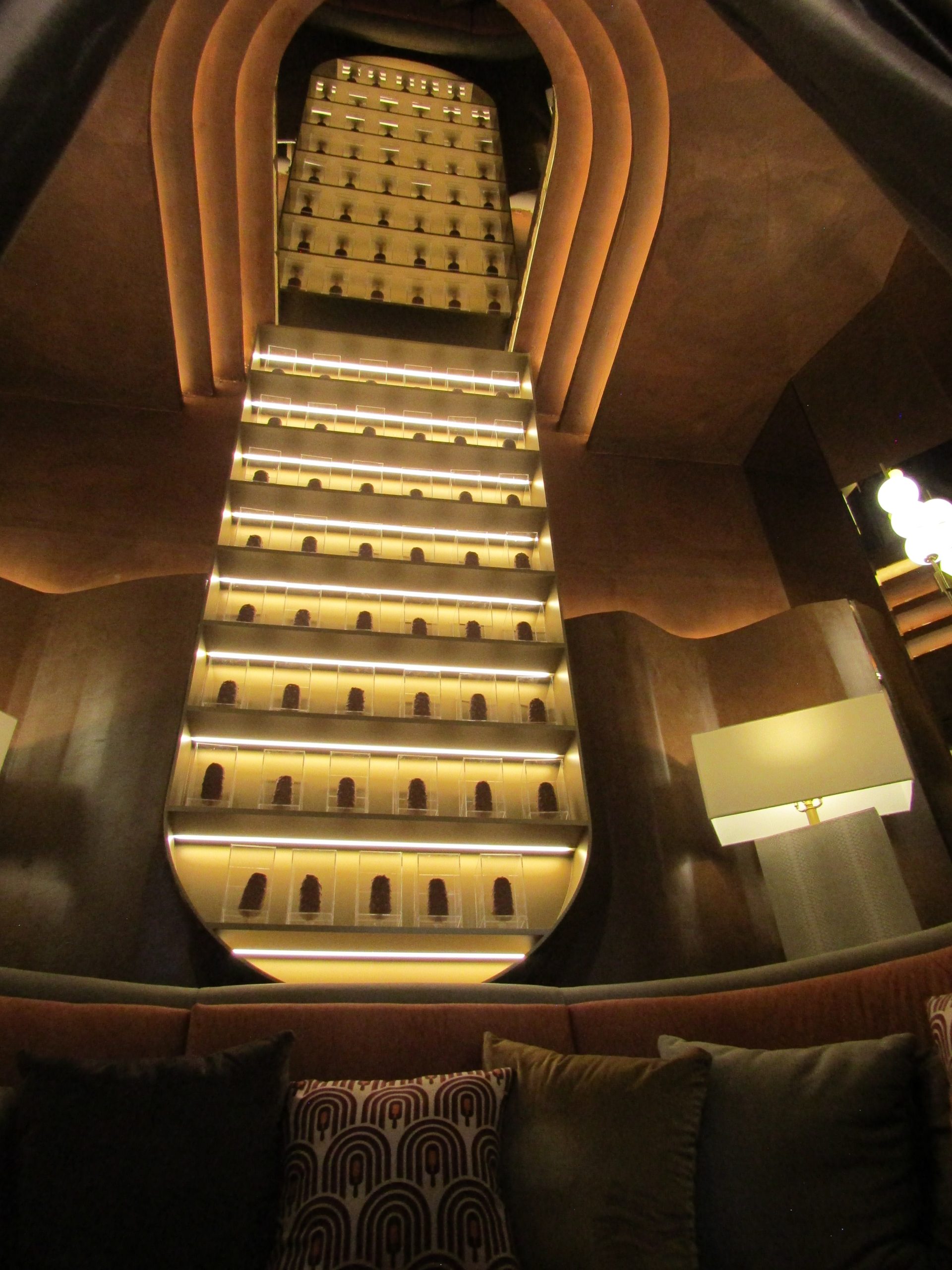 El espacio apuesta por una estética que remite a bares clandestinos de los años 20, con iluminación cálida, texturas envolventes y una paleta dominada por tonos chocolate y destellos dorados.