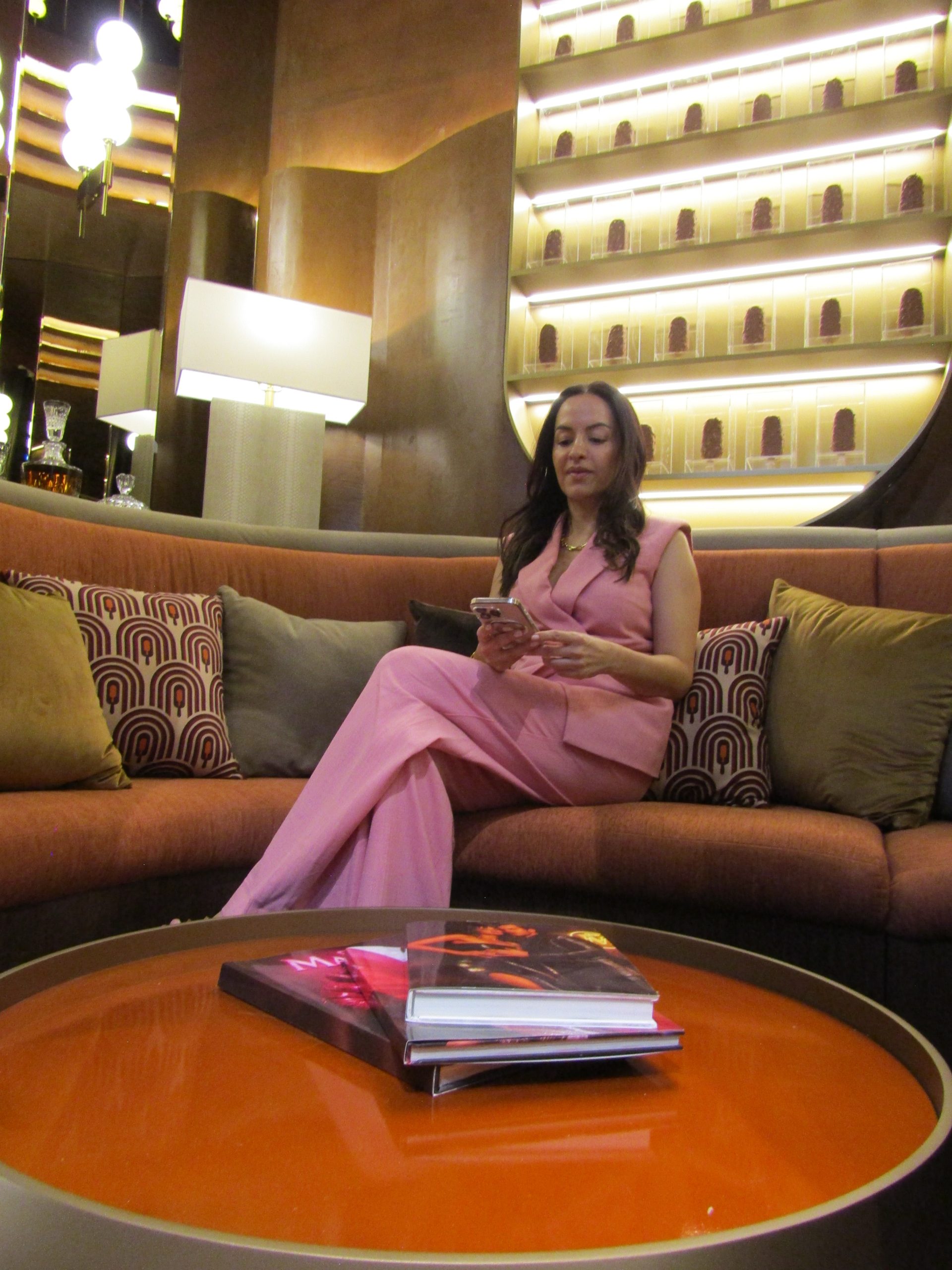 El espacio apuesta por una estética que remite a bares clandestinos de los años 20, con iluminación cálida, texturas envolventes y una paleta dominada por tonos chocolate y destellos dorados.