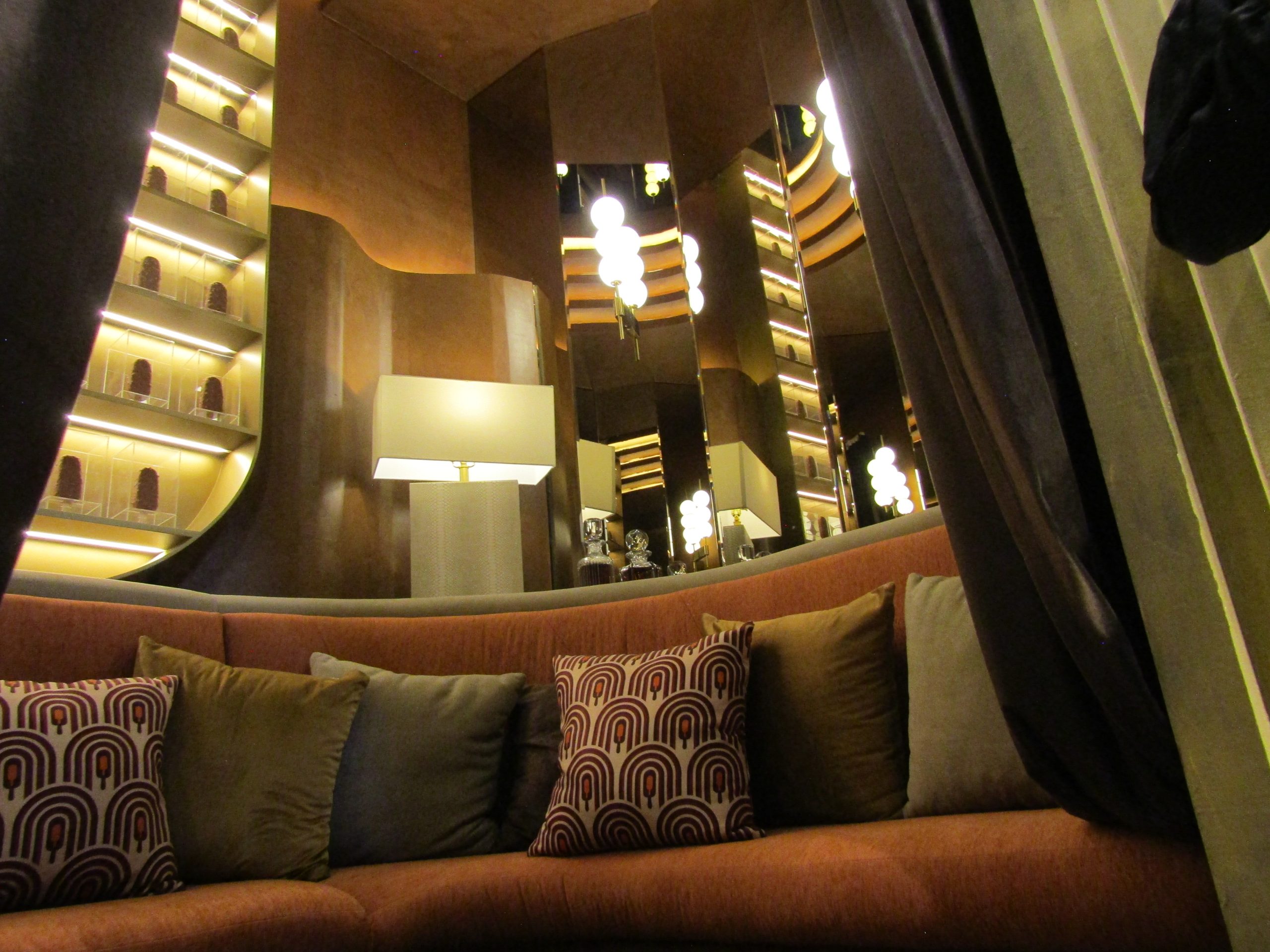 El resultado es un ambiente tipo “speakeasy”, con espejos, mobiliario protagonista y una instalación central que convierte al producto en parte del recorrido visual.
