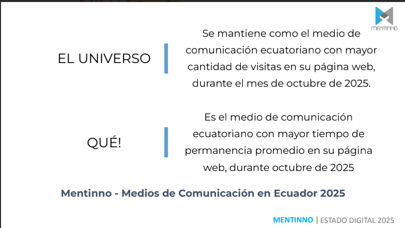 El más reciente informe Estado Digital de Ecuador, elaborado por Mentinno, señala a Quenoticias.com como el portal de noticias que lidera la atención captada en medios de comunicación del país. De esta forma, se posiciona como número uno del ranking, con 05:45 minutos de permanencia.