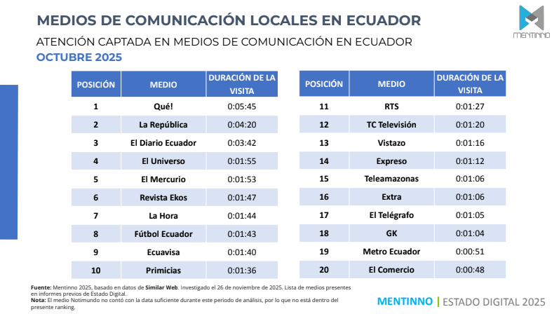 De esa forma, Quenoticias.com es uno de los medios de comunicación nacionales que lidera las métricas, hasta octubre de 2025. Así, nuestro medio se mantiene líder en la atención captada de sus lectores. Hasta abril de este año también ocupaba el primer lugar, con una permanencia de 4:18 minutos, lo que revela su crecimiento.