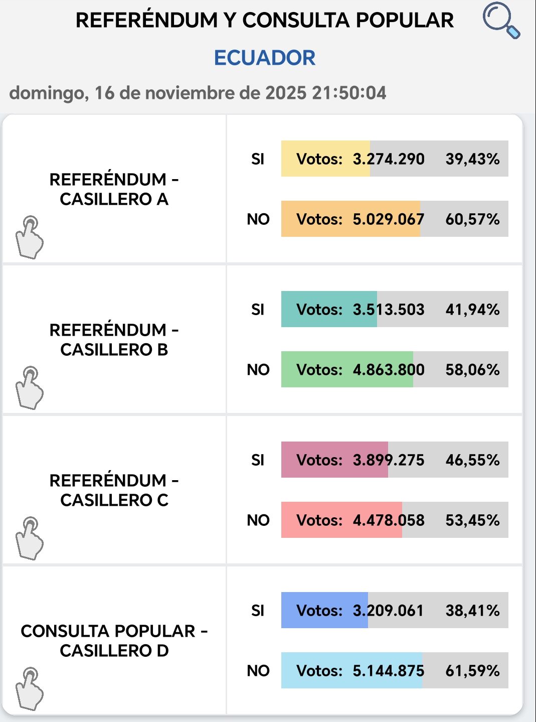 Estos son los resultados. Consultamos a los ecuatorianos y ellos han hablado. Cumplimos con lo prometido: preguntarles directamente. Nosotros respetamos la voluntad del pueblo ecuatoriano.