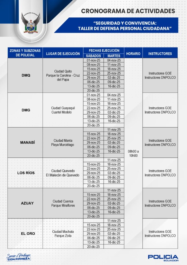 Las capacitaciones se ejecutan en Quito, Guayaquil, Cuenca, Manta, Quevedo y Machala, con presencia de personal policial certificado. Durante los talleres se enseñan técnicas básicas de defensa personal y medidas preventivas para identificar posibles situaciones de riesgo en espacios abiertos.