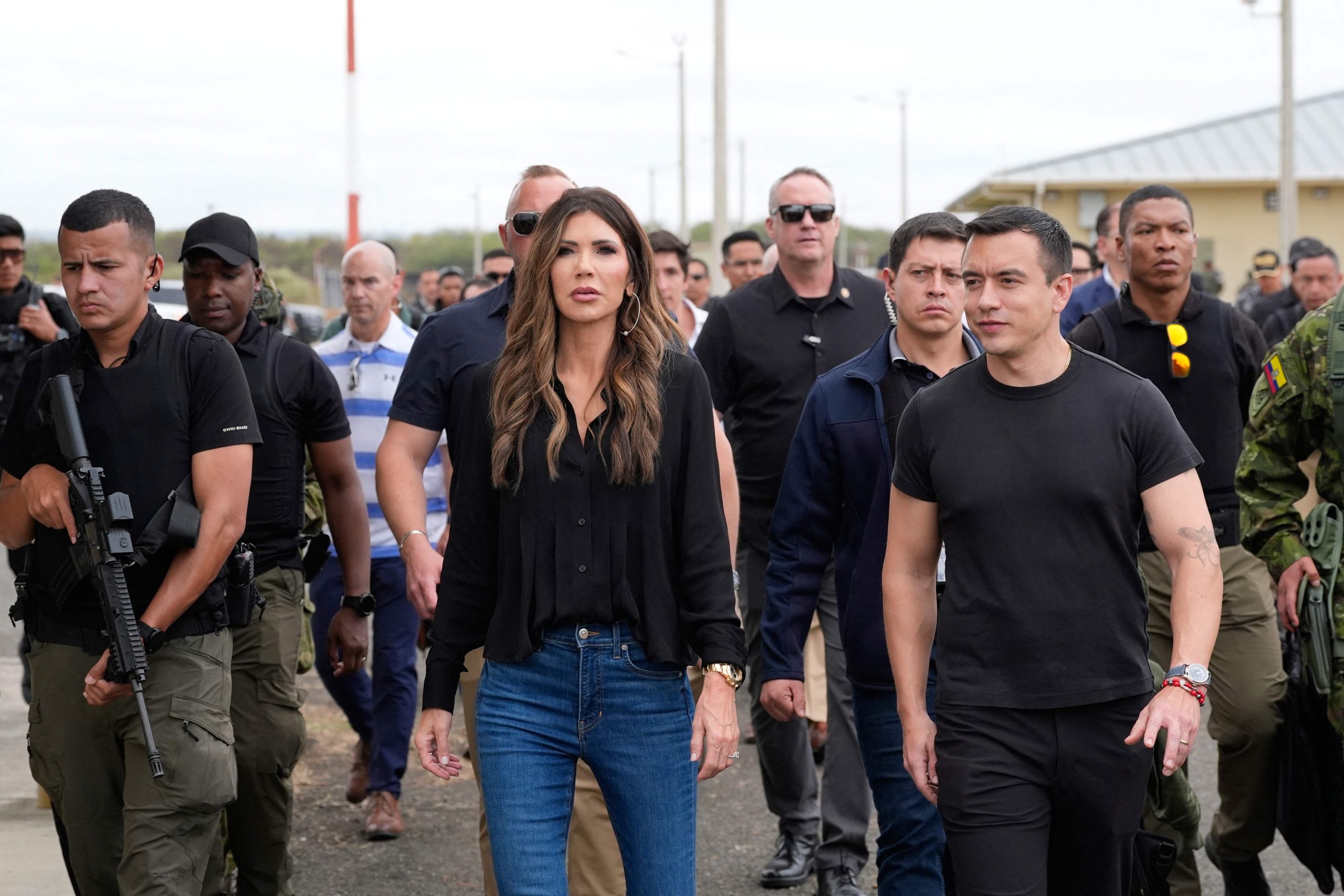 — United States Secretary of Homeland Security Kristi Noem (L) and Ecuador’s President Daniel Noboa (R) tour the Eloy Alfaro Air Base in Manta, Ecuador on November 5, 2025. (Photo by Alex Brandon / POOL / AFP)