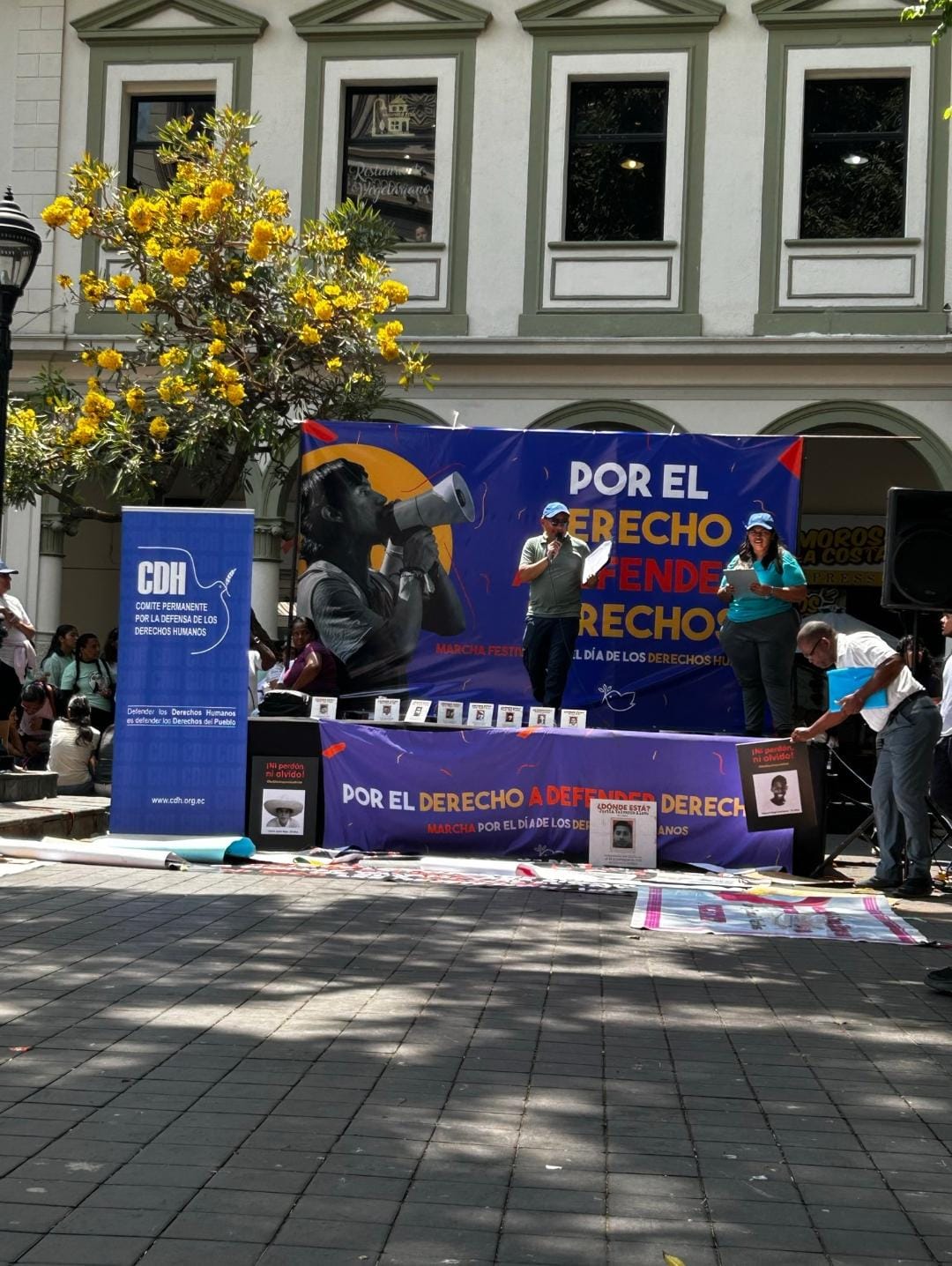 En la plaza se instaló una tarima para el Festival Cultural “Por el derecho a defender derechos”, con presentaciones de música, poesía, teatro y expresiones urbanas. Diversas voces demandaron acciones estatales que permitan ejercer esta labor sin riesgos. De manera simultánea, el CDH compartió experiencias de redes barriales, círculos de cuidado, escuelas territoriales, procesos juveniles y propuestas lideradas por mujeres, como parte de sus iniciativas comunitarias.