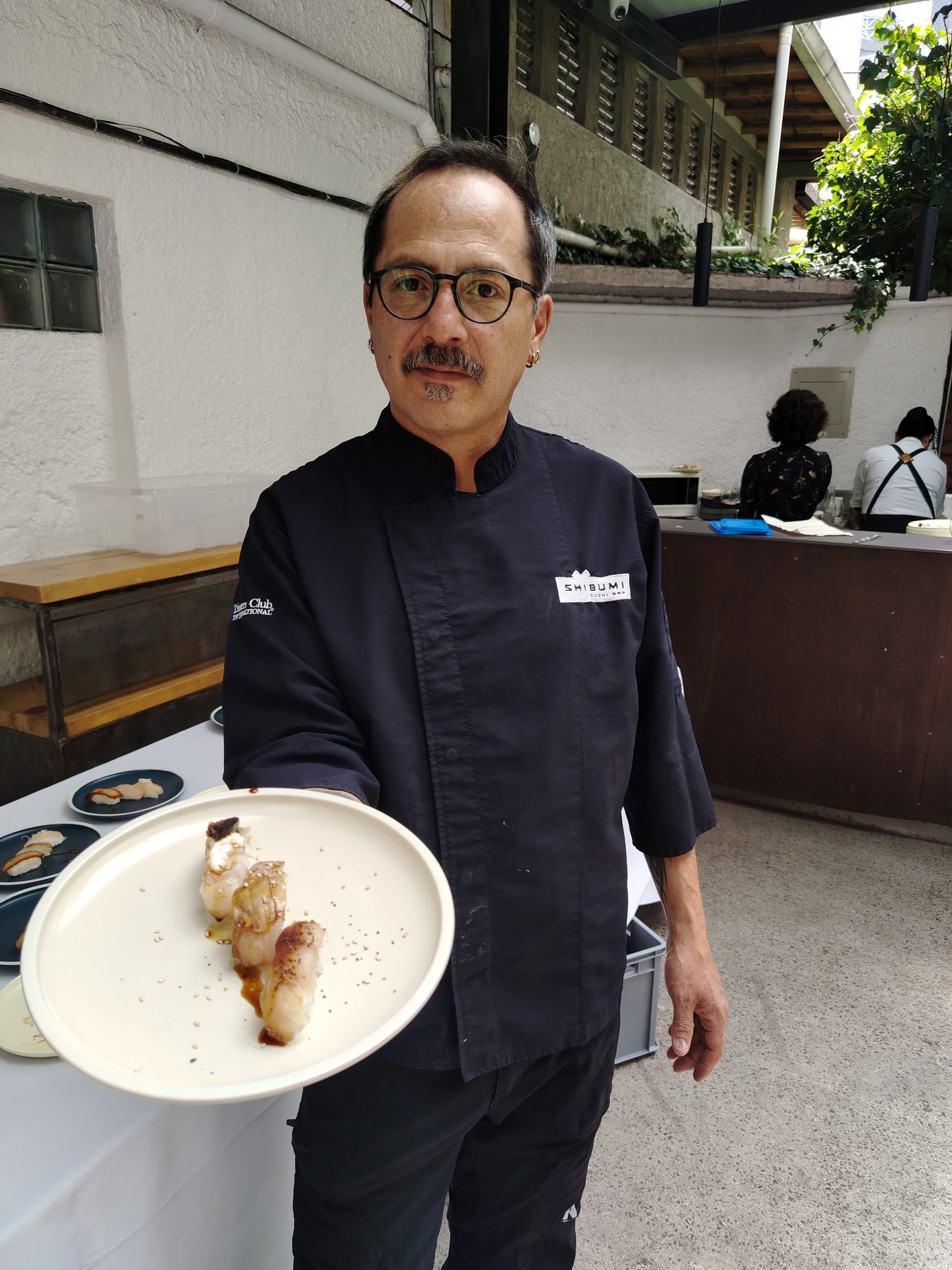 Entre cortes de pescado perfectamente laminado, bocados de arroz mezclados con salsas, mariscos, brotes y hierbas, el experto explica a los comensales lo que les ofrece. La improvisación guía su mano y ahí es donde demuestra su destreza.